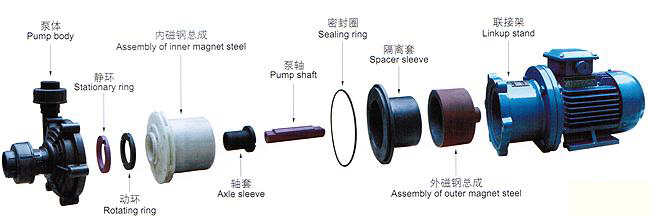 塑料磁力泵以靜密封取代動(dòng)密封,使泵的過流部件處于完全密封狀態(tài),徹底解決了其它泵的機(jī)械密封無法避免的跑,冒,滴之蔽病,磁力泵選用耐腐蝕,鋼玉陶磁,增強(qiáng)聚丙稀作為制造材料,因此它具有良好的抗腐蝕性能,并可以使實(shí)輸送介質(zhì)免受污染。