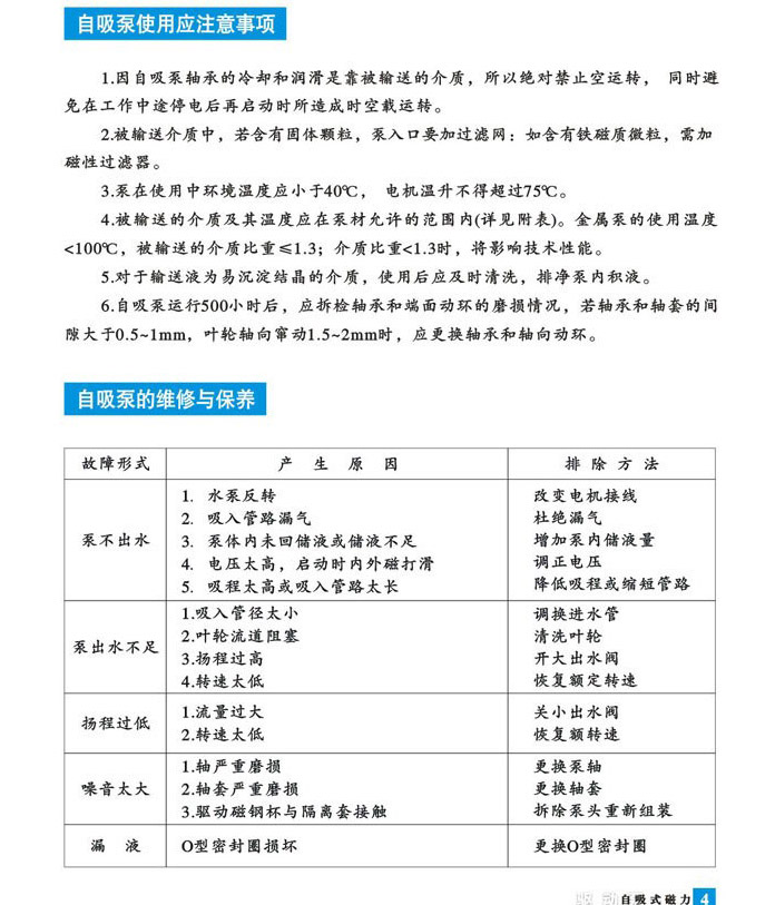 ZCQ型自吸式磁力驅(qū)動泵(以下簡稱自吸泵),該泵以靜密封取代動密封,使泵的過流部件處于完全密封狀態(tài),解決了其它泵機(jī)械密封無法避免的跑、冒、滴、漏之弊病,泵體及過流部件的材料均采用了耐腐蝕的不銹鋼、鋼玉陶瓷、四氟石墨等材料制造,既有CQ型磁力驅(qū)動泵的功能,又集自吸于一身,不需底閥和引灌水,自吸高度4米。